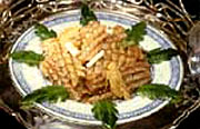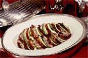 2、 ネギ、ショウガをナベに入れて、スルメイカを巻いたものを入れて少し炒め、味をよく調節して薄めのくずあんをかけてお皿に盛り付ければよい。