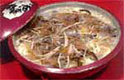 1、 ネギ、ショウガをナベに入れて、タウナギの細(xì)切り、熟したトリのささみの細(xì)切り、マツタケの千切りを入れて味が出るまで炒める。