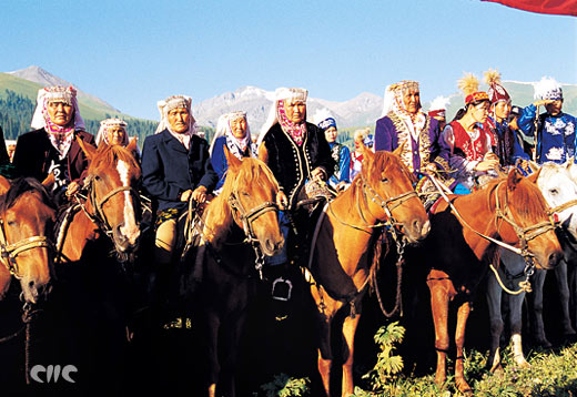 イリ新源県の草原で開かれた集會に參加したカザフ族の女性たち