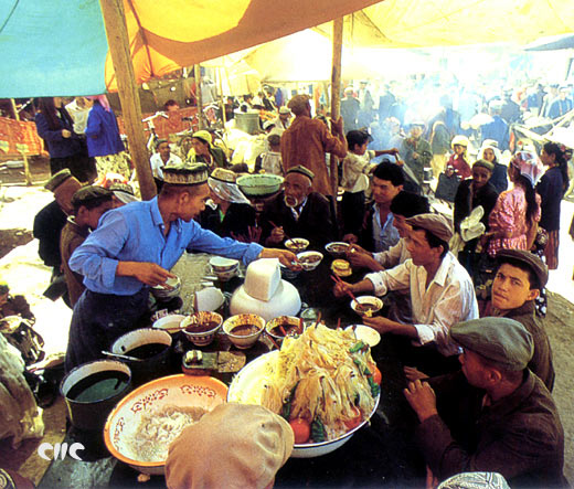 ウイグル族の涼粉(緑豆などで作った寒天狀の食品)
