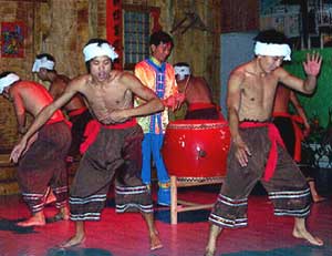 La danza con tambor funerario es ejecutada sólo por los hombres, pero las mironas pueden hacer comentarios, enviarles miradas de amor y dar aplausos como quieran. Los muchachos bailan con brazos desnudos y hacen como que beben licor, demostrando su belleza viril hasta la saciedad. Sus movimientos son arcaicos, simples, tensos o flojos. Son tan fuertes como el viento de la monta?a y tan suaves como el agua del arroyo alternativamente, embelesando a los espectadores.