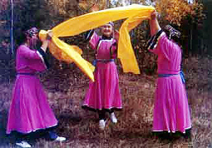 La danza Hoguera es una danza recreativa de los ewenkis que viven en las monta?as. Sin restricción del número de participantes, hombres y mujeres, de uno/una por en medio y formados en un círculo, bailan cantando alrededor de la fogata. Dicen que los pasos de esta danza eran muy variados en el pasado, pero ahora se han reducido a tres: lento, medio rápido y rápido. Todos andan despacio en el sentido del reloj y se tuercen hacia atrás, luego las mujeres apoyan sus brazos en las manos caídas de los hombres y éstos las llevan a girar en forma circular. Ahora la danza llega al clímax. Mientras el corro se vuelve más compacto, cada quien tira uno y el otro pie adelante por turno. Cuando tiran el pie derecho, mueven las manos unidas atrás y juntan las cabezas adelante; y cuando tiran el pie izquierdo, echan el cuerpo atrás y mueven adelante los brazos. Conforme se acelera el canto, los movimientos se tornan cada vez más difíciles y todo el mundo para cuando ya no puede continuar.