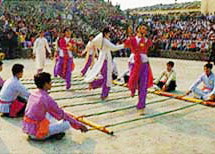 derecha formando flores con los dedos y flores volteada y entonan con dulzura el canto de ofrecimiento de varillas de incienso para bendecir a los dioses. Mientras la melodía cambia de ritmo, la danza se torna rápida y alegre divirtiendo a los dioses y a los admiradores.