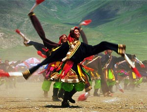Cuando es una fiesta étnica, la gente, vestida de gala, con buenos deseos y plena sinceridad y entusiasmo, se junta a bailar. Su ritmo fuerte, su canto alegre y su pasión atraen la mirada de envidia de los mirones forasteros y ganan sus exclamaciones de elogio. Estas danzas de las etnias chinas, ya vigorosas o suaves, ya originadas de las ceremonias con sacrificios o en busca de compa?eros o compa?eras de por vida, y ya sean de cualquier tipo o etnia, despliegan desde distinto ángulo y a la perfección los profundos sedimentos culturales de la nación china de Oriente.