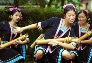 La danza con siringas, popular de tradición, es apasionante y alegre. Se originó de las ceremonias realizadas antes de la siembra y después de la cosecha en homenaje a los dioses y los ancestros. A través de la evolución, hoy es una danza de la gente joven para divertirse y buscar novios. Llamada caitang o cailusheng, se practica en las fiestas o en la época ociosa de las tareas del campo.
