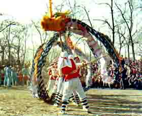 Entre los festejos se practican las danzas y cantos legados de las dinastías Song (960-1279) y Qing (1644-1911). Desde la antigüedad la nación china toma al dragón por tótem. Con el tiempo este animal mitológico ha sido endiosado. Se cree que es capaz de volar por las nubes, revolver el río y el mar y decidir sobre la sequía o inundación, debido a lo cual es muy respetado por los hans, agricultores por tradición, y disfruta de las ceremonias con ofrendas. Durante la Fiesta de la Primavera, de norte a sur hay toda clase de imágenes del dragón en medio de la ensordecedora explosión de cohetes y de su humo que tapa el cielo. De todas las imágenes, la más conocida es la del “dragón de tela” o “dragón de color” colosal, de diez metros de largo y hecho con cintas de seda de color.