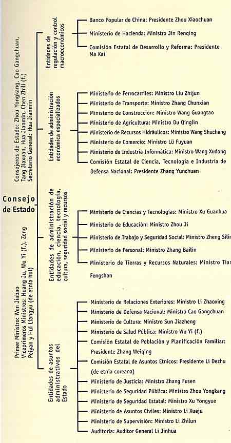 El Consejo de Estado es compuesto por el Primer Ministro, los Viceprimeros Ministros, los Consejeros de Estado, el Secretario General, los Ministros, los Presidentes de Comisiones, el Presidente del Banco Popular de China y el Auditor General. La actual estructura del Consejo de Estado puede verse en la siguiente tabla.