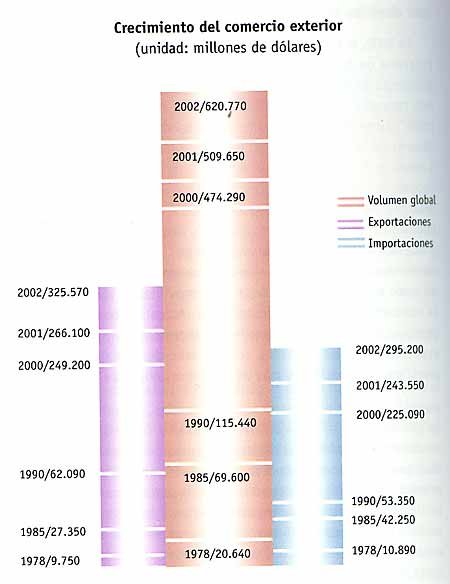 En la lista del comercio mundial, China pasó del puesto 32 en 1978 al 15 en 1989, al décimo en 1997 y al sexto en 2001, durante el cual, el volumen global del comercio de importación y exportación de China alcanzó los 509.650 millones de dólares, siendo 24,7 veces, 4,6 veces y el 157 por ciento el de 1978, 1989 y 1997. En 2002, este volumen llegó a una nueva cota, con 620.770 millones de dólares. En el momento actual 220 países y regiones comercian con China, cuyos diez primeros socios son el Japón, Estados Unidos, Unión Europea, la Región Administrativa Especial de Hong Kong, ANSEA, República de Corea, la provincia de Taiwan, Australia, Rusia y Canadá.